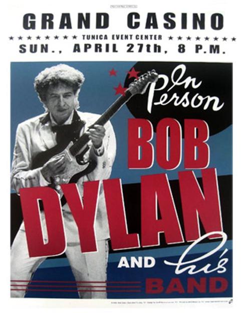 BOB DYLAN memorabilia Original poster from Dylan's 2003 "In Person" Tour at the Grand Casino in Tunica, MS. 35 x 50 cms + Original "Eye of Horus" Bob Dylan store merchandise plastic bag + B&W Fridge magnet bought at the concert.